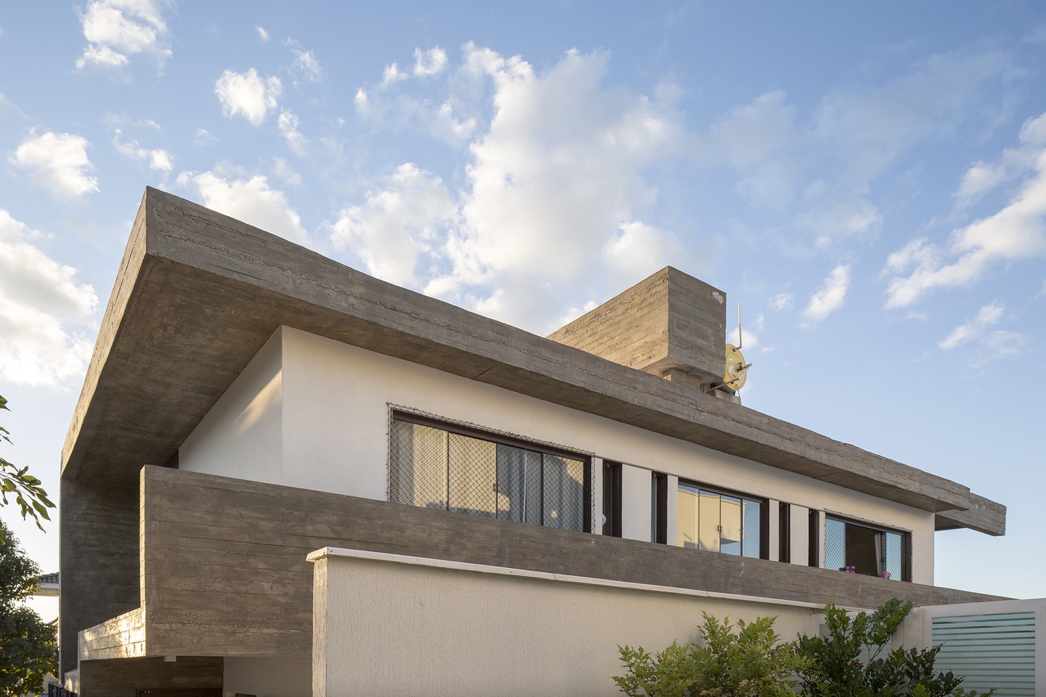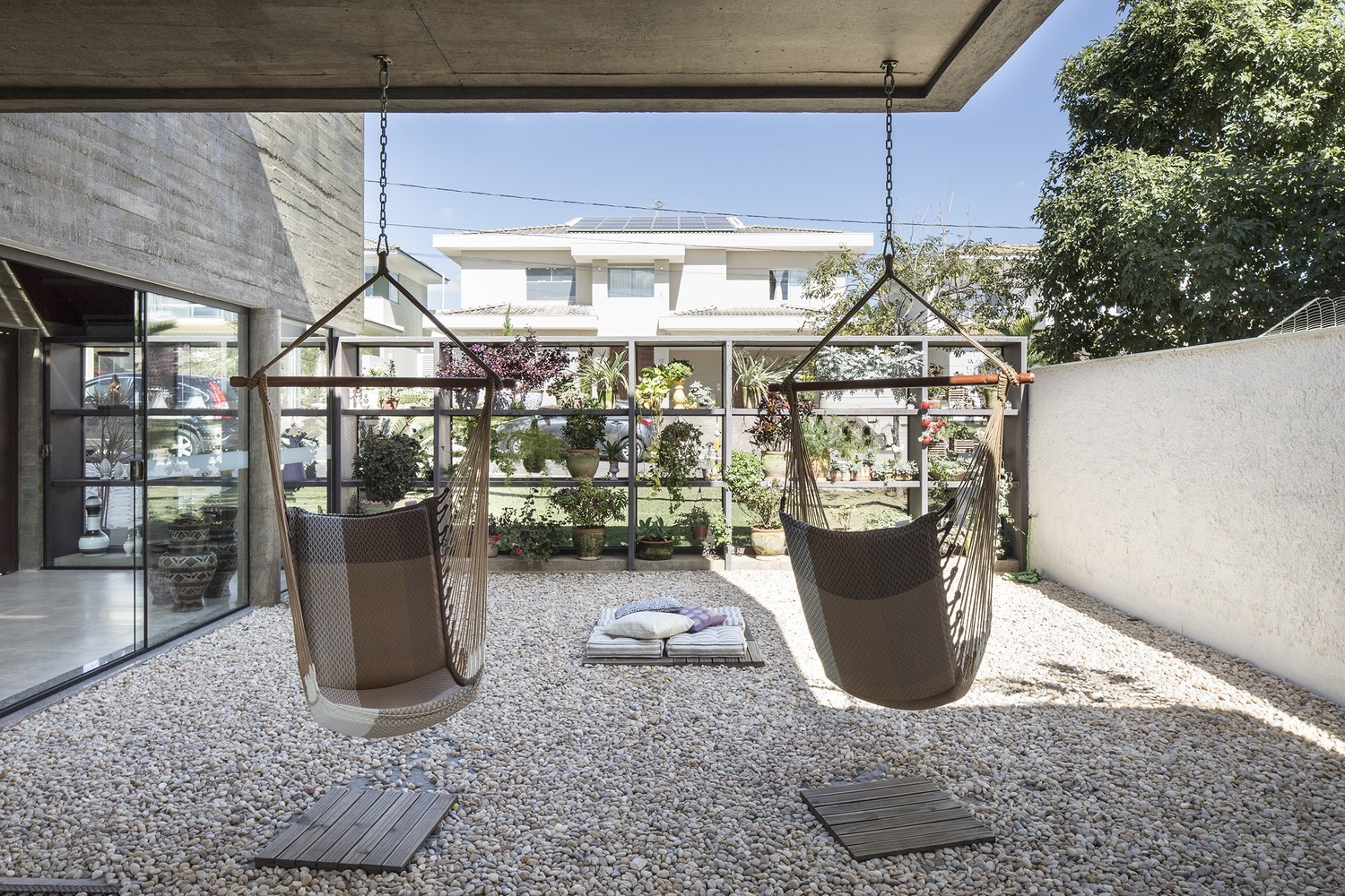A premise of spatial fluidity was tied to the continuity between interior and exterior of the residence. For this, the external spaces subdivided into three portions, with different scales. In the front part, next to the main access, an internal patio serves as a second living room, external, but more intimate by having the house itself as limits and a green wall – a kind of living fence/ panel, composed by pots of Marajoara (typical pottery from the north of Brazil) and different vegetal species. In the back, a larger and collective leisure area is visually connected with the upper terrace – area on the main linear volume – where you can find a better view of the beautiful valley surrounding the condominium. To highlight the view, the back of the house slopes slightly, seeking an alignment with the visual and a consequent topological relation with the surroundings.