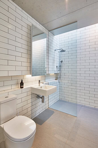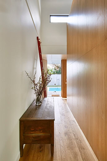 The approach and transition into the home was an integral part of the modular design. As such, all of the services are concealed from view. Visitors enter via a large pivoting door that penetrates the wall. They then move through a timber battened walkway where dappled light from the courtyard filters through before entering into the double height entrance space. The main living zone opens out to the north-facing courtyard, encouraging afternoons by the pool lounging to the soundtrack of nature.
