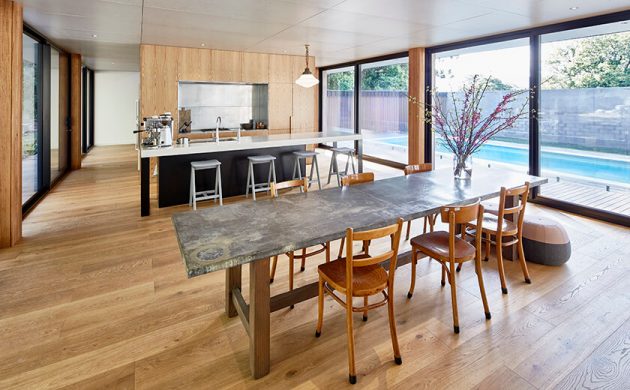 Meeting all the functional requirements of modern, sustainable design, the home has a total floor area of 465 sqm and consists of 11 modules with a large, open plan kitchen/living/dining area at its heart. A timber joinery core conceals services such as butler’s pantry, laundry and powder room and houses a staircase leading to an upstairs music room.