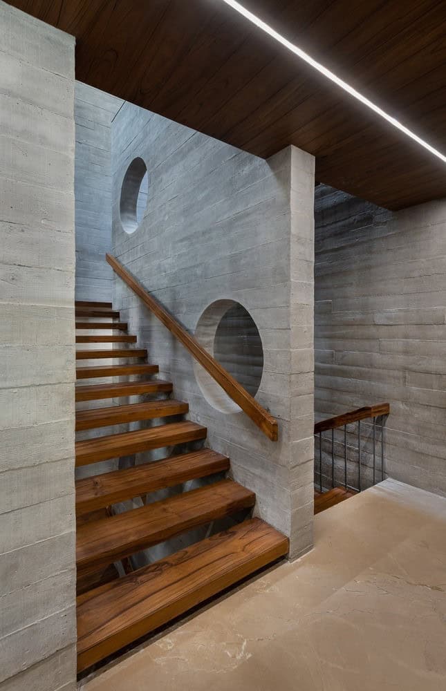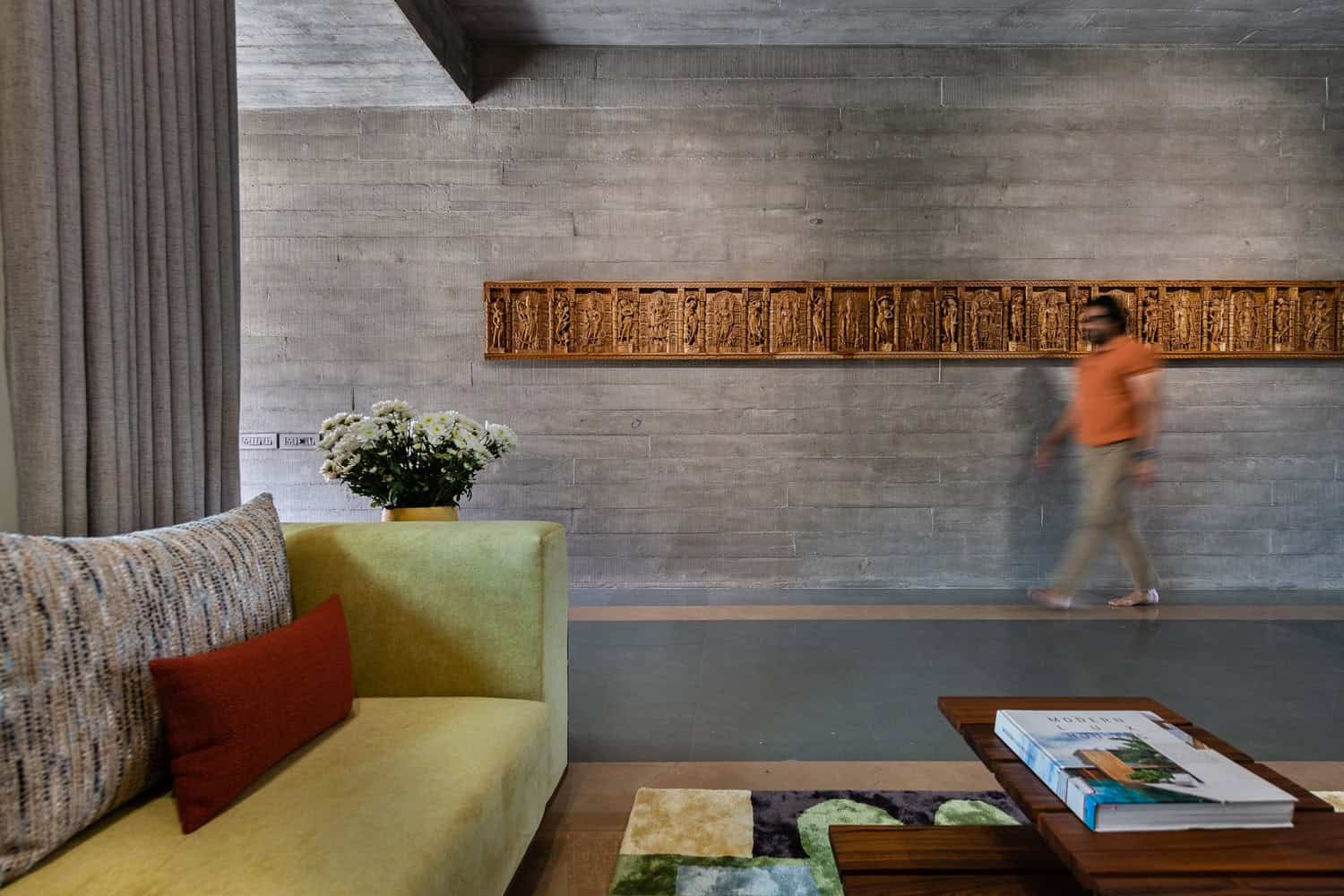 Concrete is the architectural protagonist. Its natural grey tone and timber-formed surface textures establish a tactile narrative. This is complemented by Kota stone, sandstone, reclaimed wood, and teak furnishings, forming an unadorned yet refined material palette.