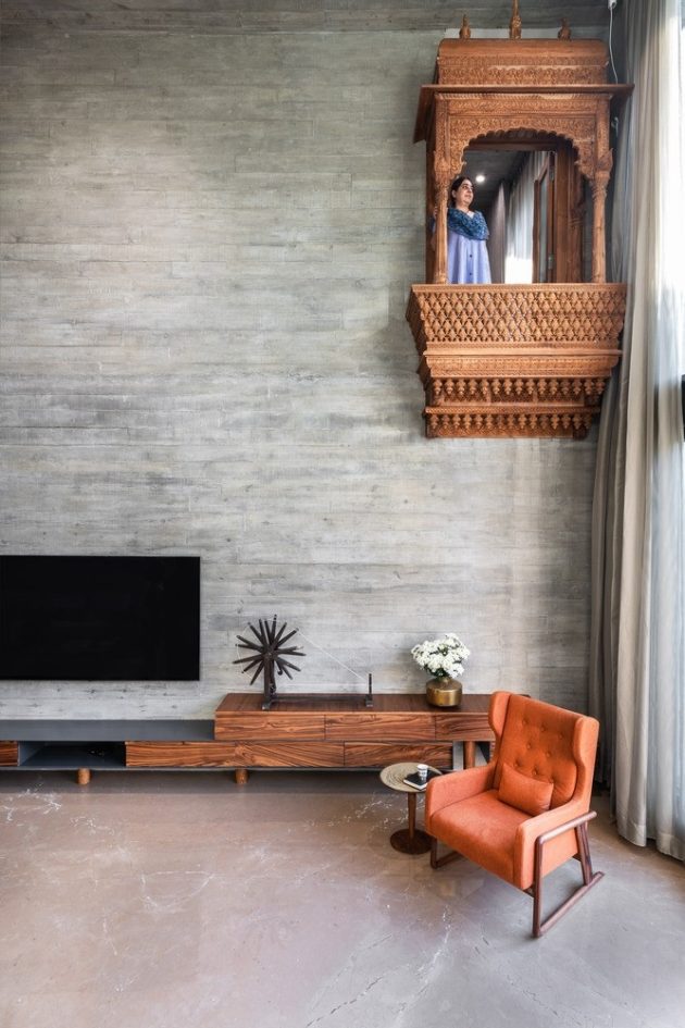 While the concrete form is bold, its heart is emotive. Inside, reclaimed Haveli panels, antique mandapas, carved vessels, and handcrafted jharokhas provide a cultural counterpoint to the building’s modernist rigour. A large jharokha in the living room even connects visually with the upper level, blending vernacular memory with contemporary functionality.