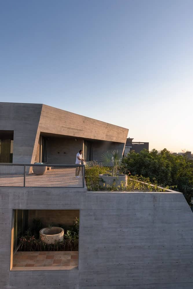 The home is organized around a southwest-facing plot, requiring protection from harsh sun exposure. The architects employed a series of deep cantilevers, skewed volumes, and staggered terraces, creating shaded zones and gardens that wrap around and within the built form.