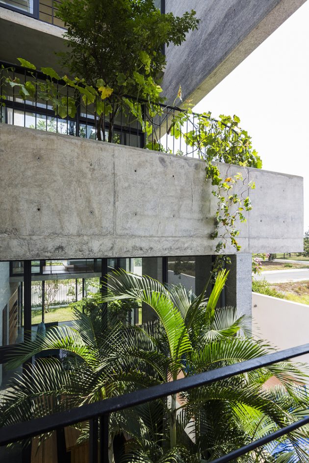 The building is organized with vertical stacking where the gardens and glass walls are bound between the two main concrete facades. This is a strategy that improves the micro-climate by introducing natural ventilation and daylight into every room while also increasing the visibility and interaction inside the home.