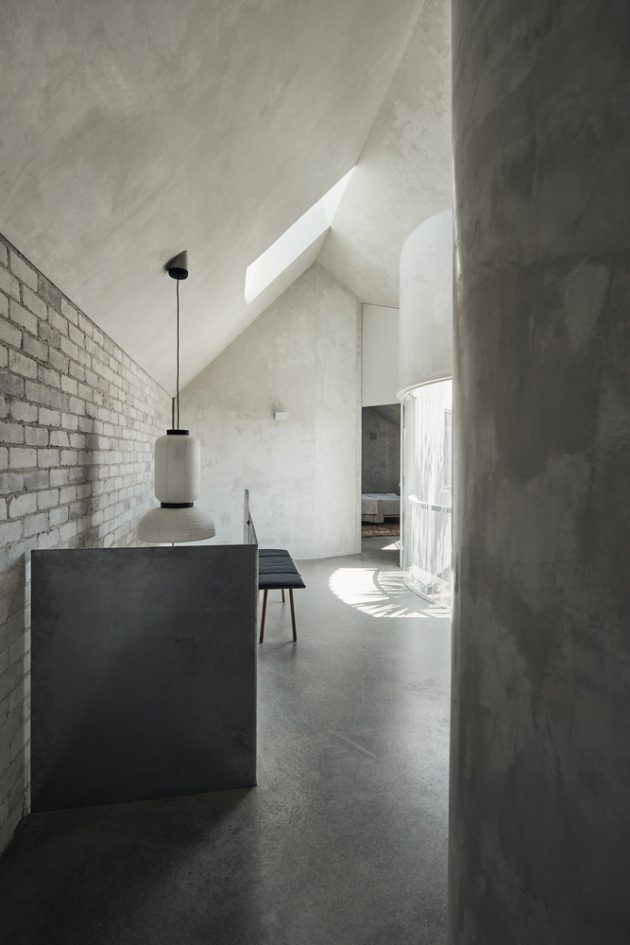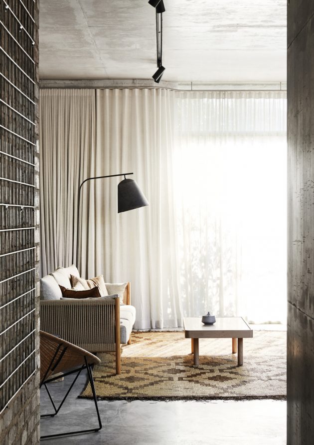 Custom designed, locally made pieces enrich each space: the living room primer-red steel storage unit/wall; bespoke steel doors integrate into raw concrete and brick reveals; crafted timber screens mediate laneway activity; bedroom shelves curve with fine rods tracing overhead.