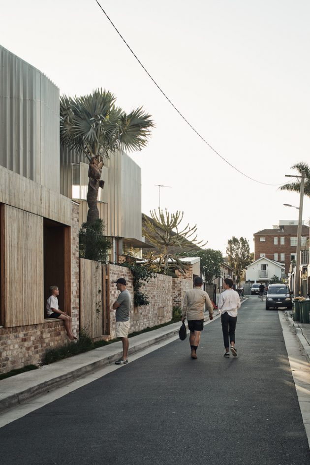 The upper level, containing three bedrooms, is conceived as a solid mass that carves voids for light, creating diagonal and oblique viewing lines along the length of the laneway for the bedrooms, thereby moderating potential privacy loss from the rear facades across the laneway. These scoops of light allow the garden to be continuous along the majority of the site length, with the main scoop shaped around a new Bismarck Palm introduced as part of the garden works.