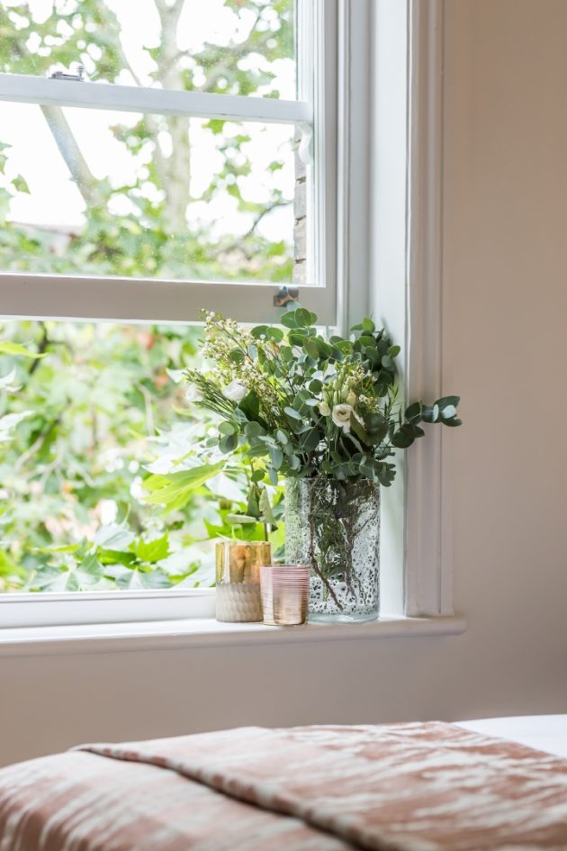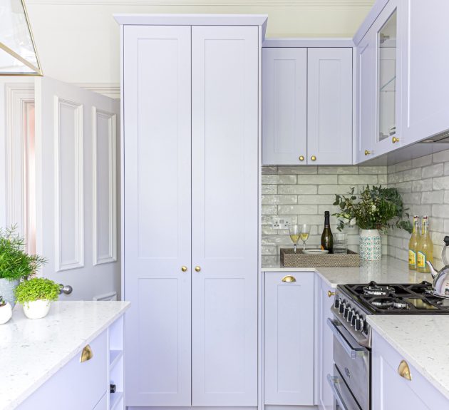 The kitchen benefitted from a window with views of the beautiful, tall tree outside, which it  shared with the master bedroom. For the kitchen a fresh, bold and invigorating colour palette was selected, pale lilac lacquer, palest dove grey, and gold details with bleached wooden shelving created a fresh and bright modern kitchen with plenty of visual interest.