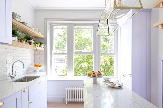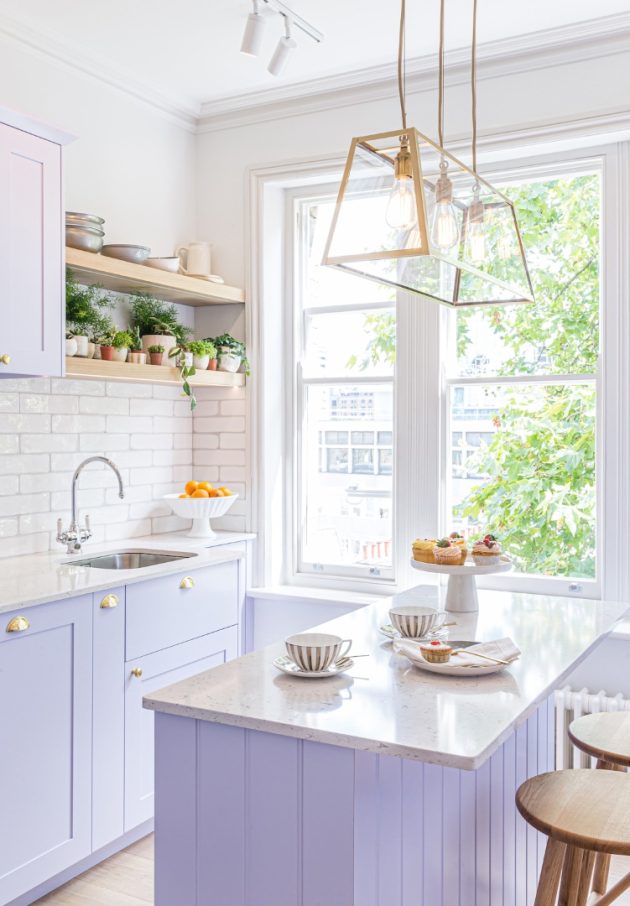 Bright pastel lavender kitchen with white subway tile backsplash, open wooden shelves with plants, and large windows bringing in natural light, creating a cheerful and inviting space filled with fresh décor.