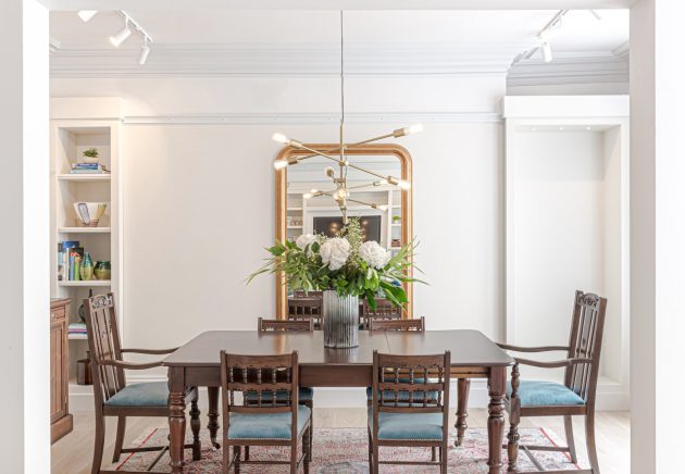 As a contrast to the period furniture the space was contemporised by a large contemporary, brass pendant light with exposed squirrel cage lamps to sit above the dining table. An opulent, oversized, gilt framed wall mirror bounced light into the room. Bespoke joinery alcoves were positioned either side of the chimney breast making the most of all available space. The clients’ richly patterned persian carpet helped pull all the visual elements together.