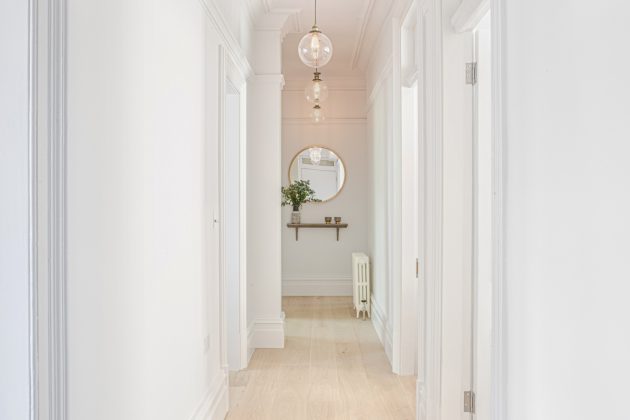 The high ceilings throughout the property were emphasised with a tonal colour scheme in half tones of grey picking out coving and skirting details. Large dramatic pendant lamps were specified all the way down the corridor to emphasise its length, with a large round mirror and a console shelf creating a visual full stop at the end.