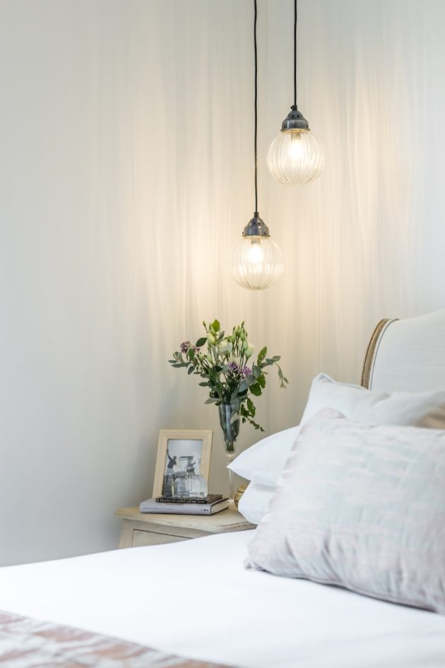 A soft romantic feel for the master bedroom suite was created with a palette of bruised pinks, greys and taupes, with a mix of tactile fabrics to create a decadent mood. The french styled bed in a natural coloured grey linen with a bleached wooden frame, complemented the elegant classically styled bleached out bedside tables, which had staggered height vintage ribbed globe pendant lights above them. A large vintage metal distressed chandelier was sited above the bed.