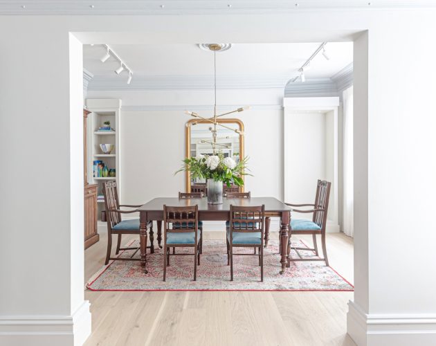 The brief was to keep and enhance the period details of the apartment, incorporating the clients’ inherited furniture pieces and combining them with new contemporary pieces to create an eclectic mix that suited the clients aesthetic.