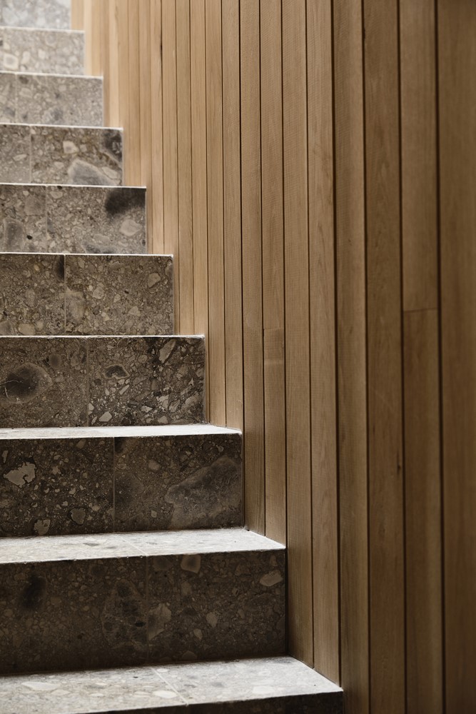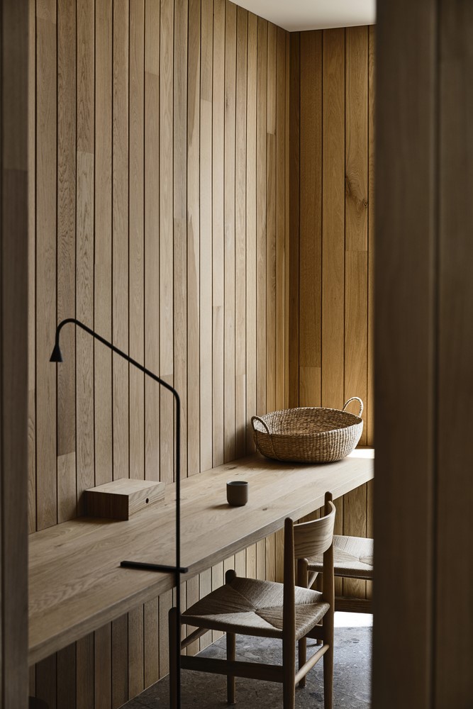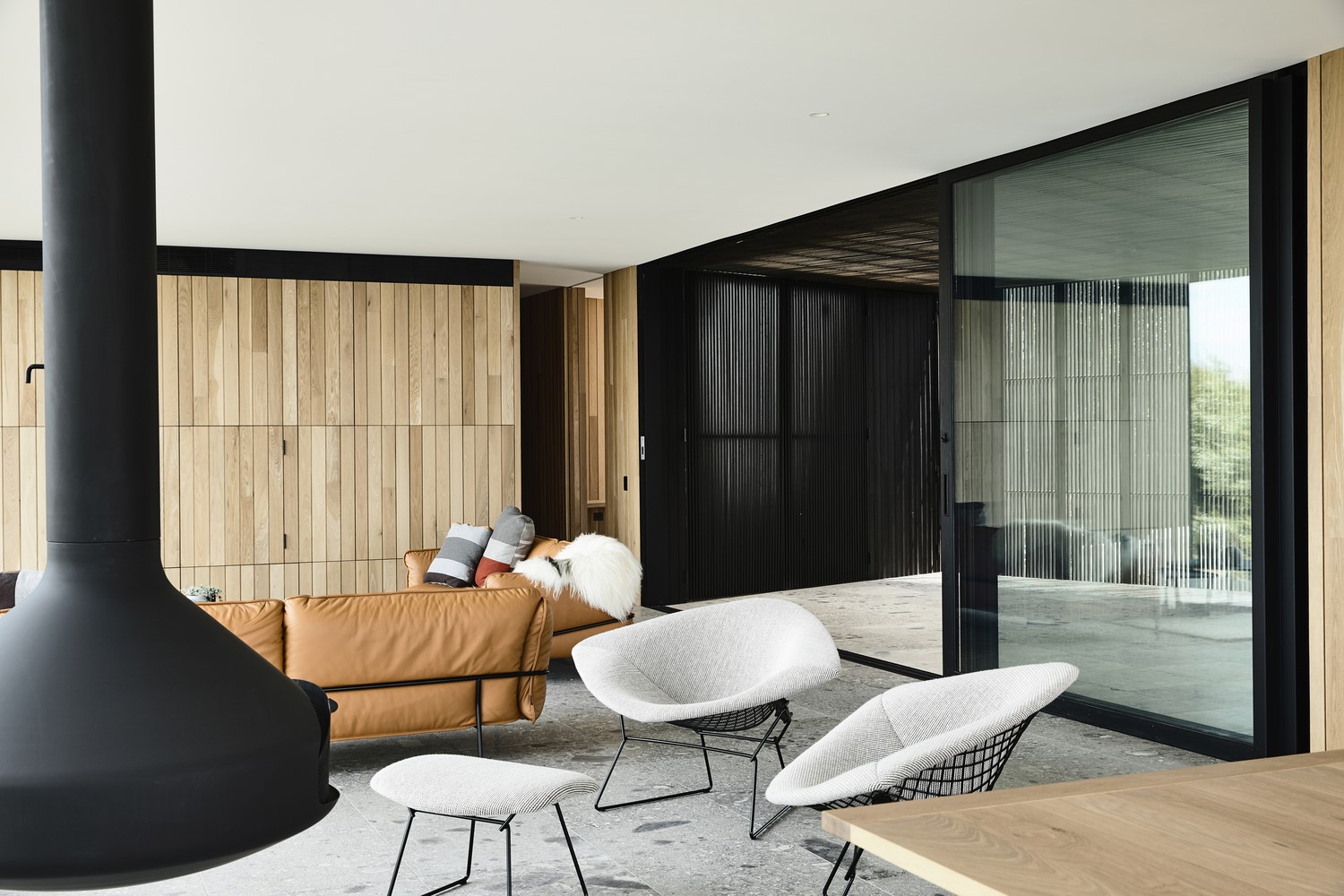 The palate of materials recedes in the landscape: stained black, the spotted gum shiplap clads the exterior form and is balanced by full bleed glazing that mirrors hues of the landscape. A continuous volcanic stone has been laid over the upper floor to further reinforce the platform. The imperfections in the stone and timber wall linings brings movement to the otherwise ordered structure. Complemented by the parallel uninterrupted ceiling plane, the constant datum defining the upper form correlates to the vast horizon and accentuate the dramatic panoramic views.