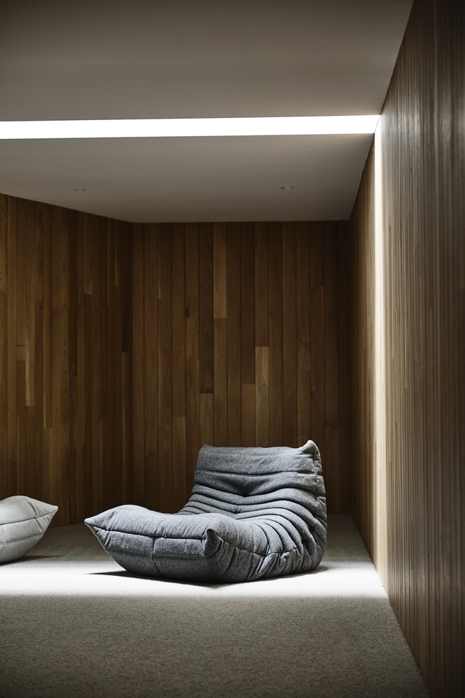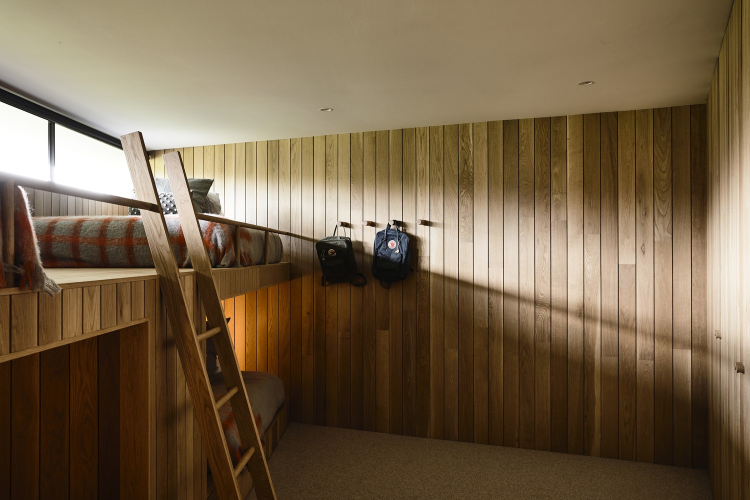 Cutting the center of the site is the meeting point of two geologies, resulting in a landslip-affected zone. Abutting the fault line, a basement, housing the children’s bedrooms and play space, is submerged three quarters of its height into the ground. The exposed quarter allows for natural light, views and ventilation. This basement acts like a large occupied footing, anchoring the house deep into the escarpment.