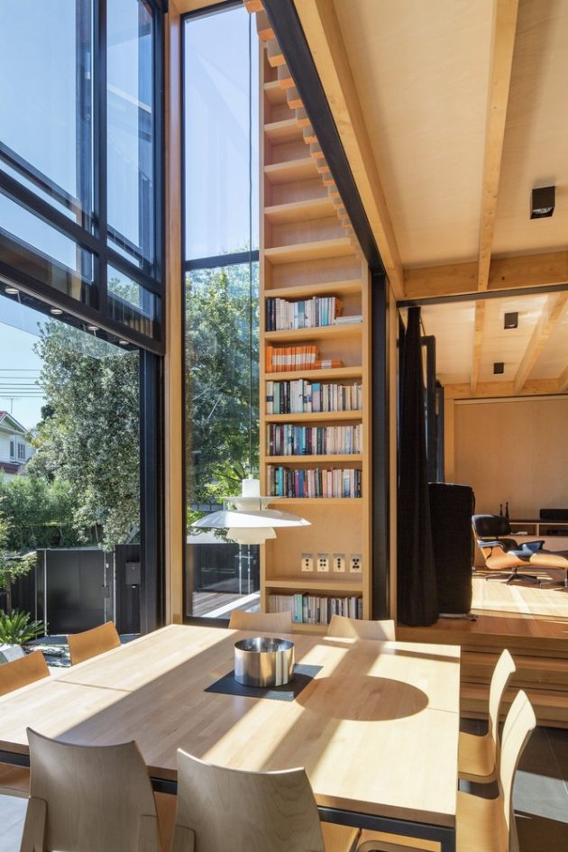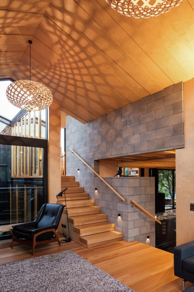 Externally, the house evokes simplicity, with its bold gabled silhouette echoing the forms of local boat sheds. Internally, however, the project unfolds as a series of intricately crafted spaces that contrast the minimalist exterior with warmth and texture.