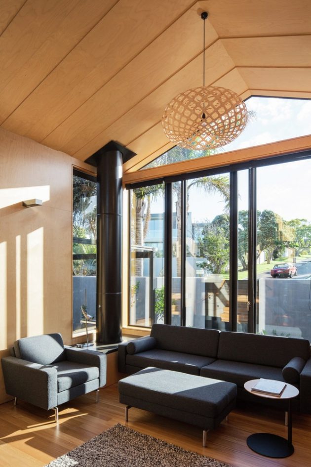 The compact corner site presented unique challenges: two 5-meter front yard requirements and a three-story neighboring structure looming on the north-west boundary. In response, the architects designed a layered scheme that maximizes transparency, capturing light, sun, and glimpses of the pohutukawa trees and ocean.