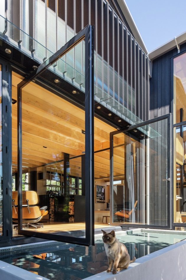 Strachan Group Architects in collaboration with Rachael Rush have completed the Boat Sheds, a 5,166-square-foot residence in Takapuna, Auckland, New Zealand. Positioned just steps from the beach, the home references the boating culture of its location through its three distinctive stepped gables clad in black, while offering a spatially complex and adaptable interior.