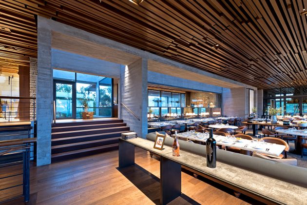 Banker Wire’s L-62 wire mesh in woven bronze utilizes the contemporary look of high-definition Lock Crimp with traditional square mesh design — a highly scalable pattern that readily interfaces with all types of structures, economical, and classic. The L-62 was selected as a cohesive design element for the exclusive wine club area of the property with wire mesh integrated into the doors, transoms, partitions, and wine lockers. Installations throughout the wine club interior varied; some applications of the wire mesh kept the material raw and exposed, while others sandwiched the wire mesh between glass partitions for a more polished look.