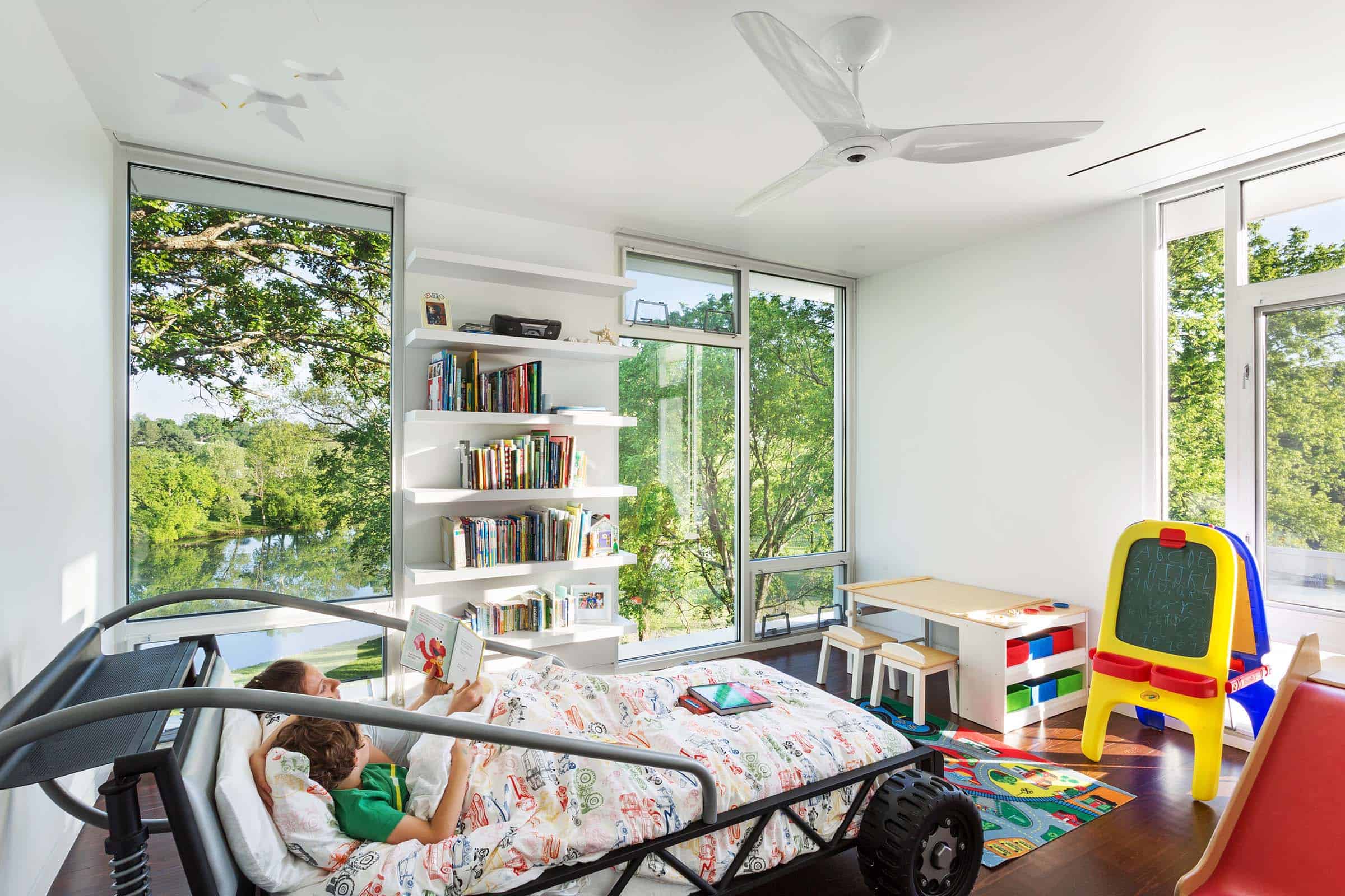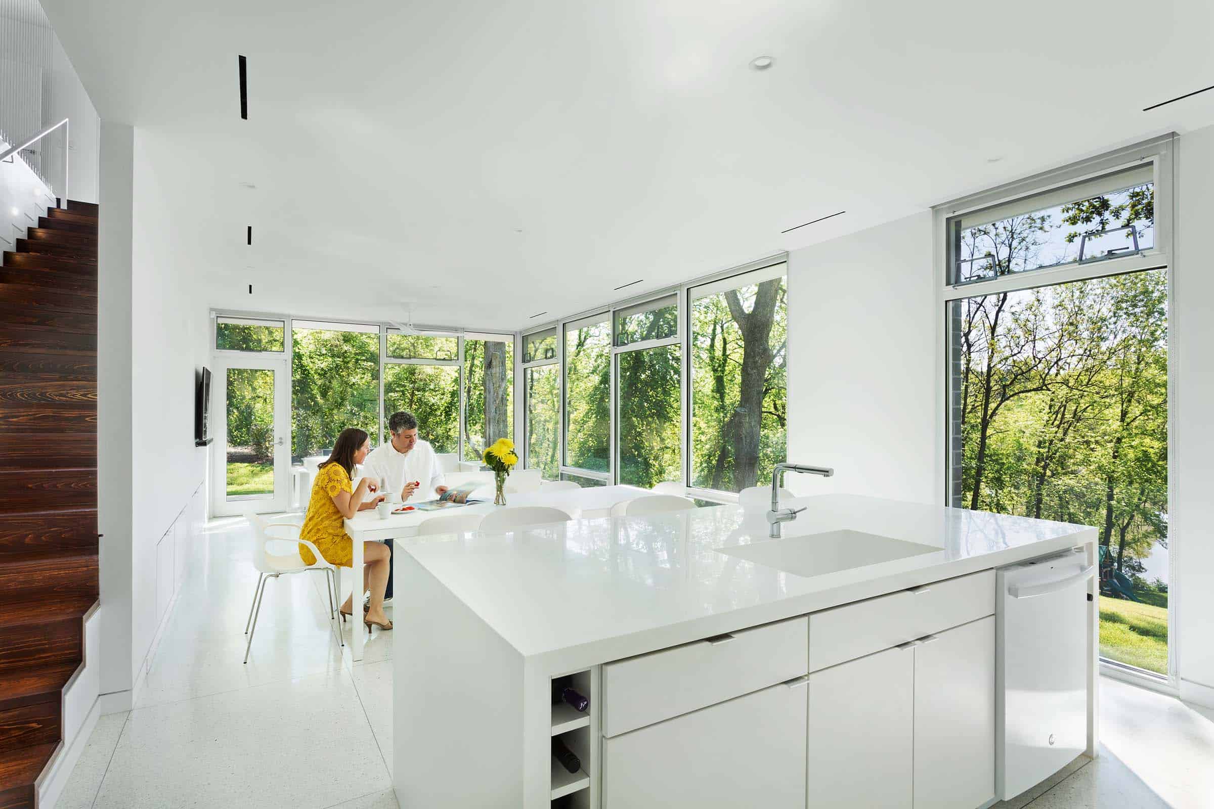 Solution: Located within the 90 year old Holston Hills neighborhood on a site overlooking the Holston River, the Boetger Residence is designed to emphasize views, embrace natural light, and maximize efficiency. Designed by BMa’s Director of Design, Chad Boetger, for his family, the home respects the scale of the adjacent traditionally styled homes while drawing inspiration from the respected mid-century modern residences located within the neighborhood. The house is organized to celebrate views of the Holston River, beginning with the approach at the carport and carrying through the living, dining, and family areas of the home. Each living or sleeping space in the home is provided floor to ceiling glass views to the exterior and each hallway is terminated with a floor to ceiling window framing views of the landscape beyond. The interior material color palette is restrained in order to enhance these views of the exterior; with the first level being a celebration of white accented against the darker wood flooring of the second level.