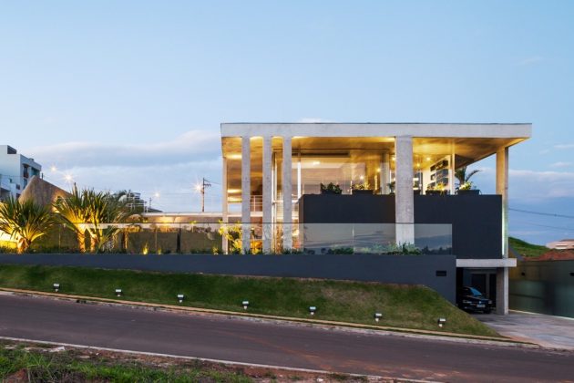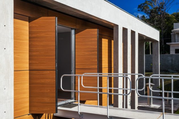 The indoors is organized in diverse sections under a wide exposed concrete roofing in reference to the modern architecture from São Paulo, specially concerning the work of Vilanova Artigas. Each section is covered with different coating so to emphasize sectorization, also improving immediate apprehension of their different functions. The terrace area that surrounds every ambient has simple height here and double height there, depending on where is the visitor located and relatively to the different internal volume. It is on this rich transition space that the inhabitants are expected to spend their time, in communion with the constructed space and the surrounding landscaping. Metallic footbridges connect the residence to compensation slopes, which serve as walls, revealing an upper garden for the familiar benefit while creating a gazebo at the main entrance to the house.