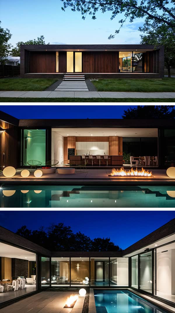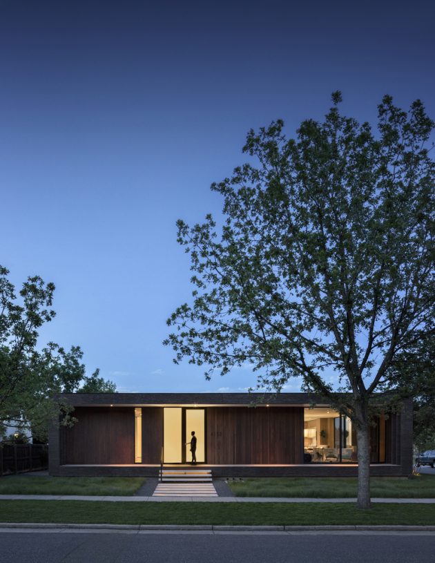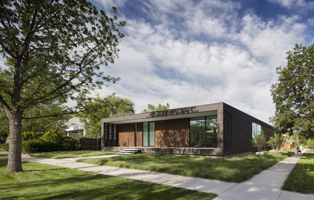 This low-lying residence expands its single floor layout over 4,600 square feet on a corner lot dotted with a variety of old trees. Its exterior design pays a modern tribute to the traditional brick bungalows with large porches that are typical for the neighborhood.