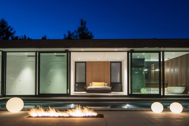 It has a simple and refined palette of high quality materials consisting of handmade brick, walnut, plaster, and glass.In its urban setting with no large dominant views to the exterior, the house turns inwards toward the interior courtyard & pool with a connection to nature by focusing upwards on the sky. This concept is inspired by modern artists’ exploration into the connection of the sky, earth, and proportion.