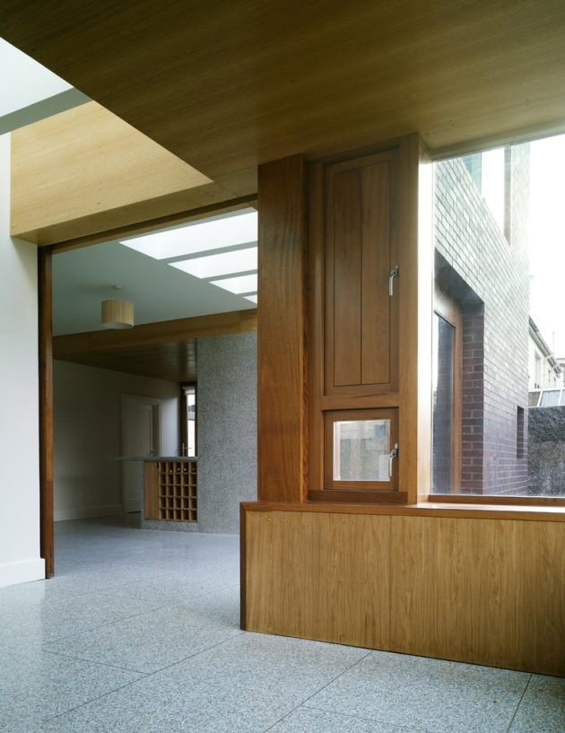 Fixed furniture and a dropped ceiling in veneered oak paneling are given the same elasticity as the external brickwork, being made to turn corners with both flush surfaces and occasional deep recesses.