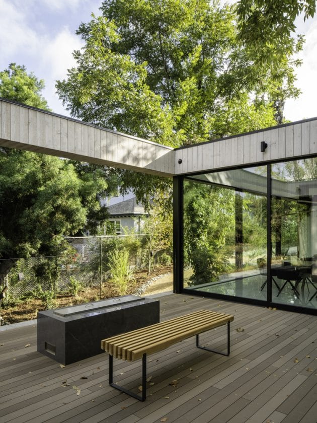 Architect Dan Brunn has decided to use a long, slender layout for his own home design, developed in partnership with MODAA. The Bridge House LA is his new modern residence occupying 4,500 square feet in Los Angeles, California. It is placed on a plot where it stretches over a small stream, surrounded by lush landscapes.
