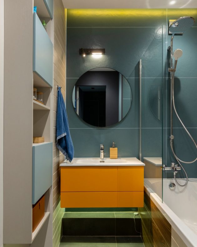 We needed a large dressing room, and in order not to waste space, leaving a huge corridor, we made a large dressing room through which you could go to the master bedroom. The children’s room is equipped for a newborn child, taking into account his growing up. The project is located in Moscow. The total project area is 80 square meters.