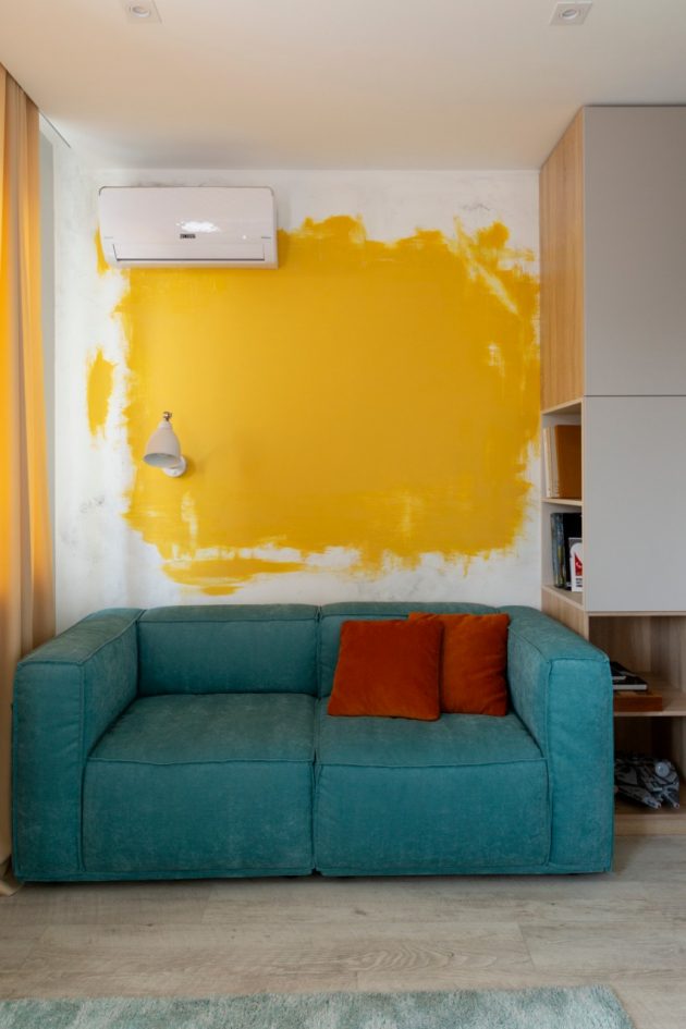 Bright elements in every room are the main feature of the project. The owners of the apartment are very fond of dogs and Batman, so the idea came to dilute the apron of the kitchen set with funny drawn dogs.