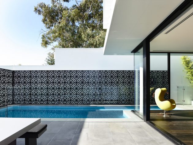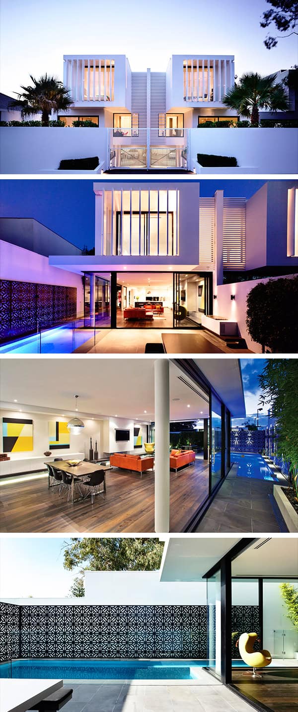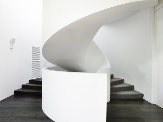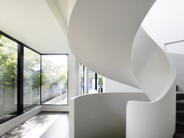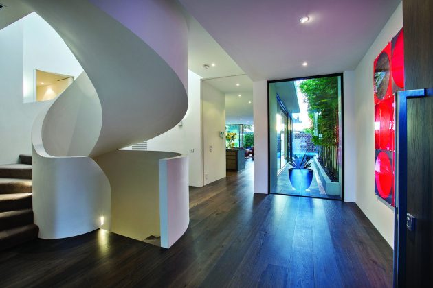 The Brighton Townhouses are a project completed by Martin Friedrich Architects in the city of Brighton in Victoria, Australia. Their designs rely on the contemporary home design principles enabling the dwellings to feature spacious living and dining rooms that can extend their area into the courtyards and wrap around pools through sliding doors. Each of the houses spans through three floors, with a spiral staircase to connect them. The interior is blessed with natural light through a large circular skylight.