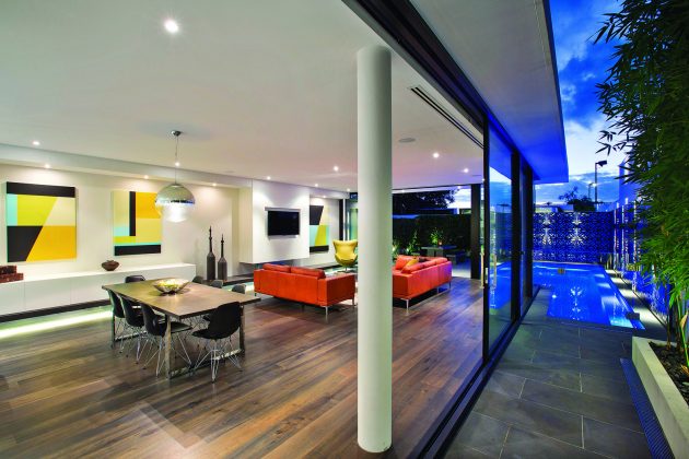 The minimalist contemporary design provides a seamless indoor-outdoor living space with a large fully glazed kitchen/dining/living room opening on the side and rear via full-width sliding doors to the entertainer’s courtyards and glass-tiled pool. The pool wraps around the main indoor-outdoor living areas.