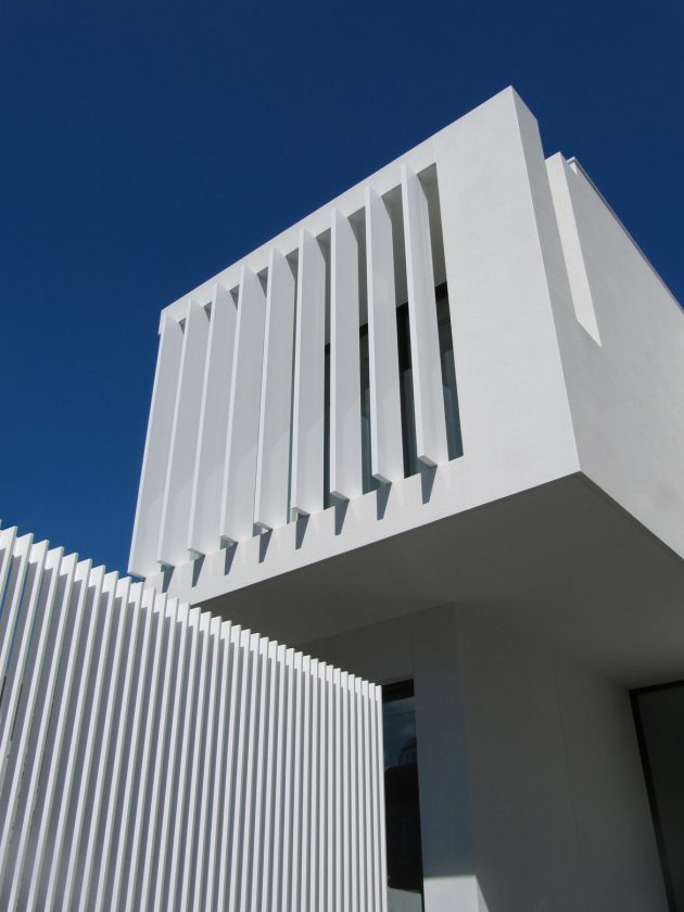 The design explores a minimalist pallet of materials finished in pure white render. Matching, white metal louvers on the front and rear provide privacy from the neighboring townhouse and break up the simple shapes of stacked cantilevered cuboidal forms. The dark-colored finishes of the otta-colored oak wood flooring, Pietro Grigio marble, and gray mink-colored carpet contrast with the white walls and add warmth and richness. The pure white house is further accentuated by the vivid colors of the artwork.
