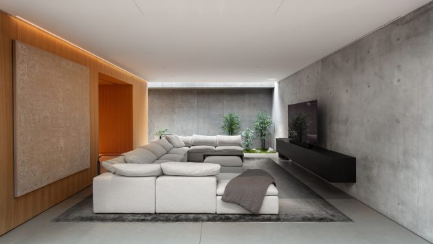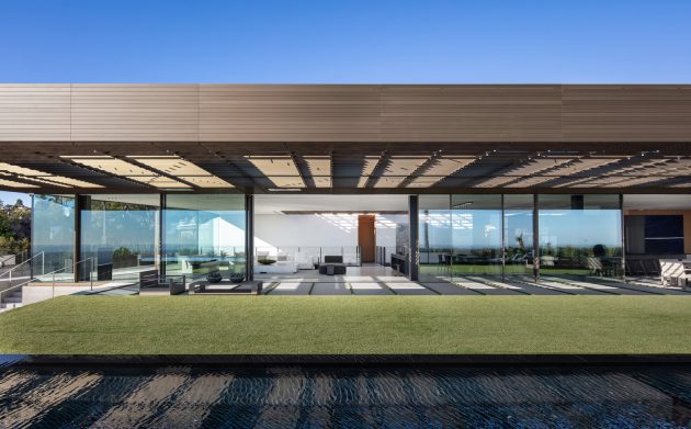 The home’s sculptural element is both functional and expressive. A 22-foot cantilevered trellis stretches out to a strip of lawn and an infinity pool. The cantilever offers respite from the sun during the day while also adding dynamism to the structure.