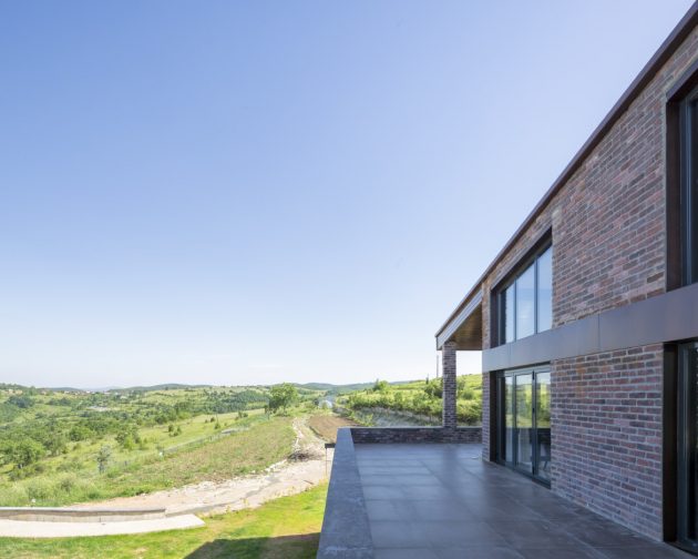 Modern brick house with large windows, open terraces, and contemporary architectural design during sunset.