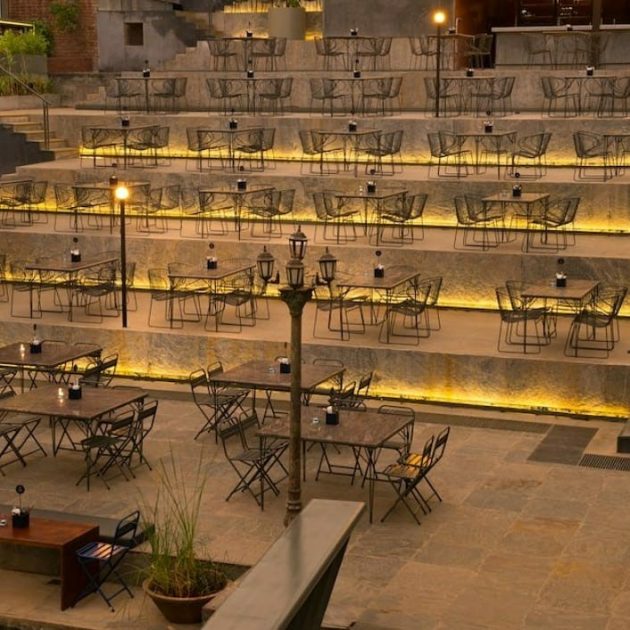 The space hosts an amphitheatre, an open kitchen, a massive ice storage unit, 5-6 different bar counters & a pond at the centre.