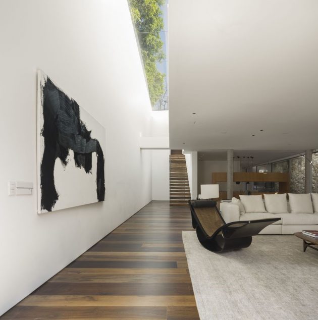Stairs are made of floating wooden steps suspended by steel cables above the entrance corridor, in a straight line connecting all three floors. In the first floor, there are three bedrooms and a home theater. Panels made of wood laths offer visual protection from nearby houses, preserving natural light and ventilation.