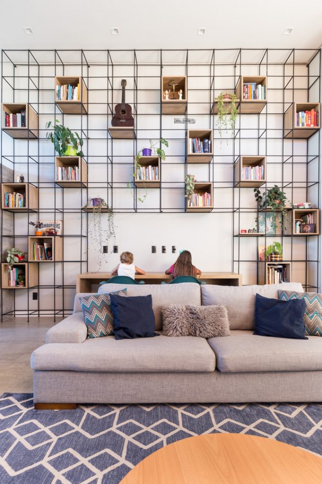 The interiors reflect the same materiality as the exterior, with the predominance of apparent concrete. The highlight is a large multipurpose bookcase, specially used to house the family books, made in the work with steel rebar left over from the construction and which became the children’s study bench.