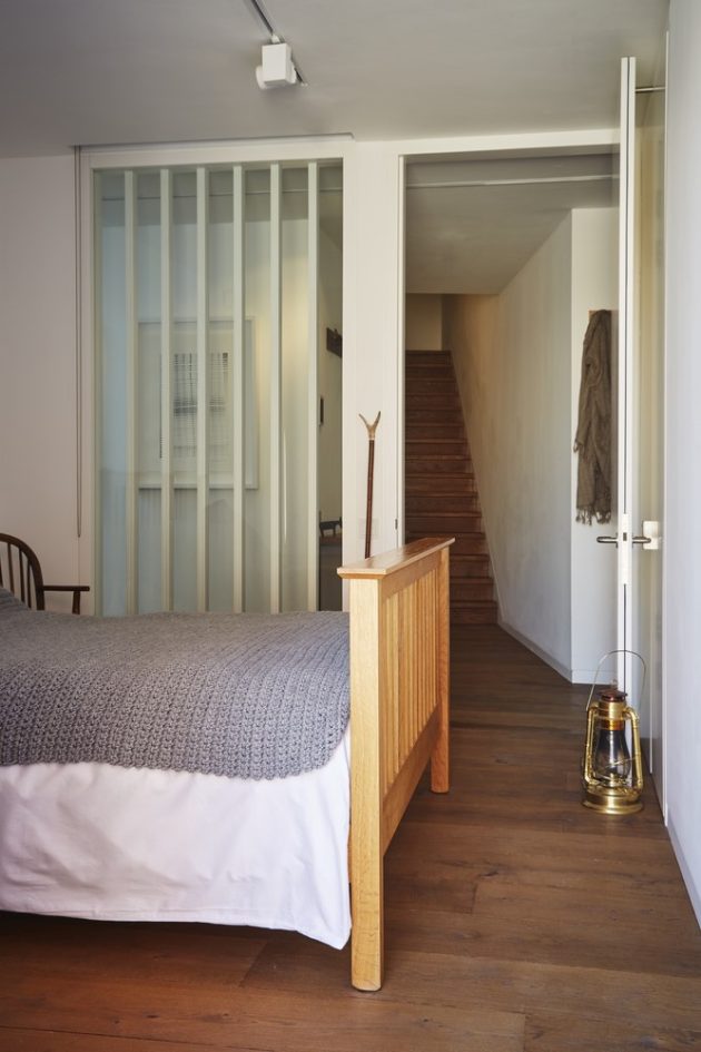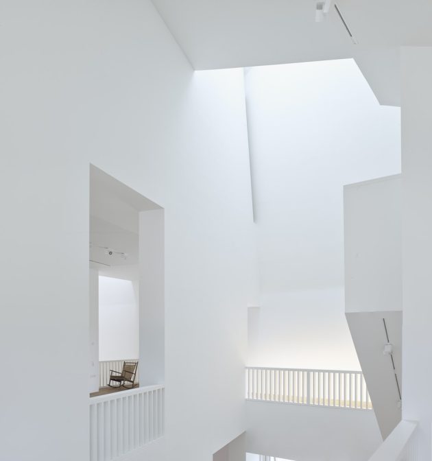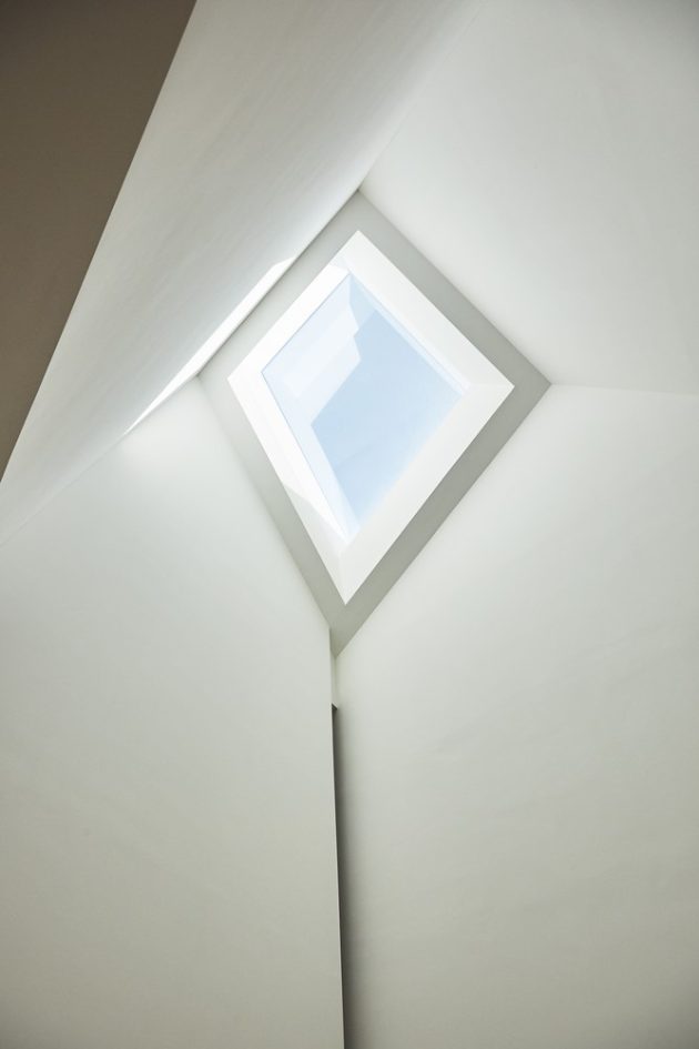 The roofs find expression from the inside of the house as well, giving magnitude to the ceilings of even modest-sized bedrooms and creating natural opportunities for light wells, the largest of which illuminates a monumental staircase descending from Caring Wood’s grand mezzanine area to the lower ground living quarters.