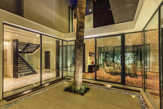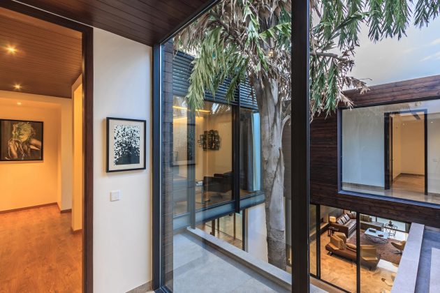 The open courtyard also serves a practical purpose: it creates a microclimate that naturally cools adjacent spaces, promoting airflow and reducing the need for mechanical ventilation.