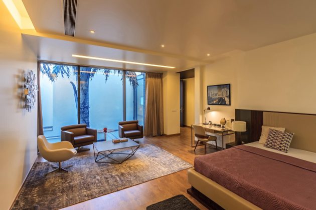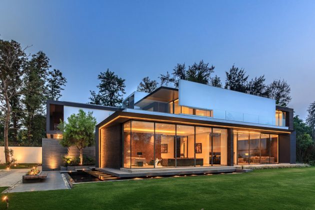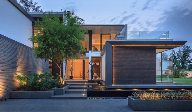 Designed by Dada & Partners, Caryota House is a 14,000-square-foot contemporary residence nestled within nearly three acres of serene landscape in New Delhi. The home was envisioned for a couple and their two daughters, combining understated luxury with a seamless indoor-outdoor experience—all while preserving privacy in a shared compound with two other houses.