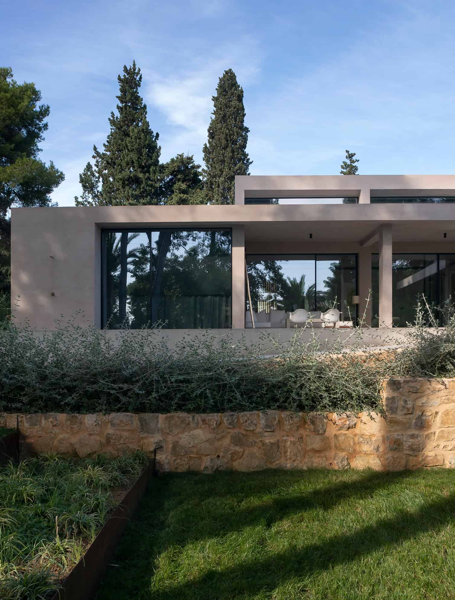 A former water basin on-site has been transformed into a striking swimming pool, anchoring the main south elevation and reinforcing the indoor-outdoor relationship.
