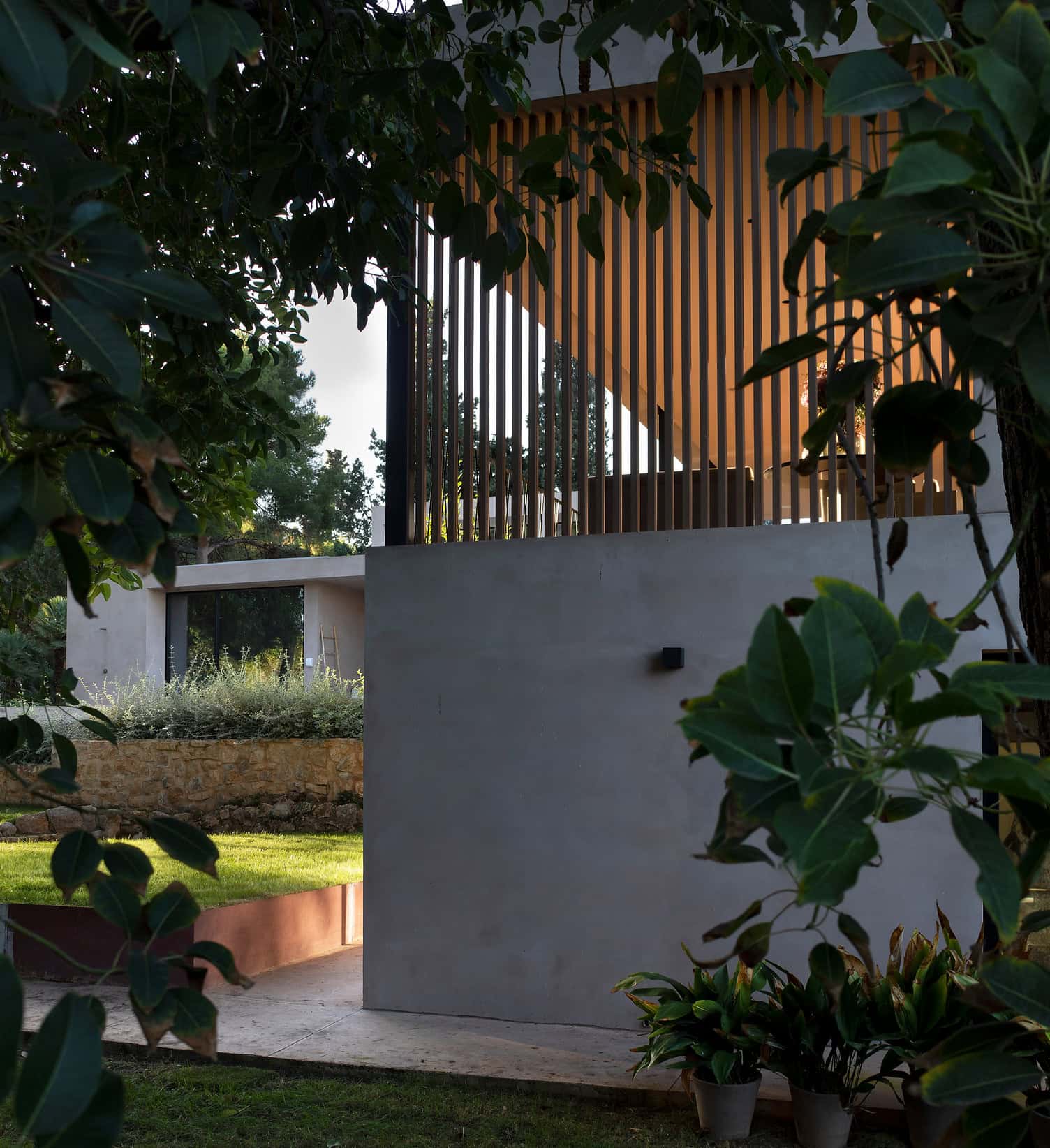 View through greenery to a modern house with wooden slatted balcony.