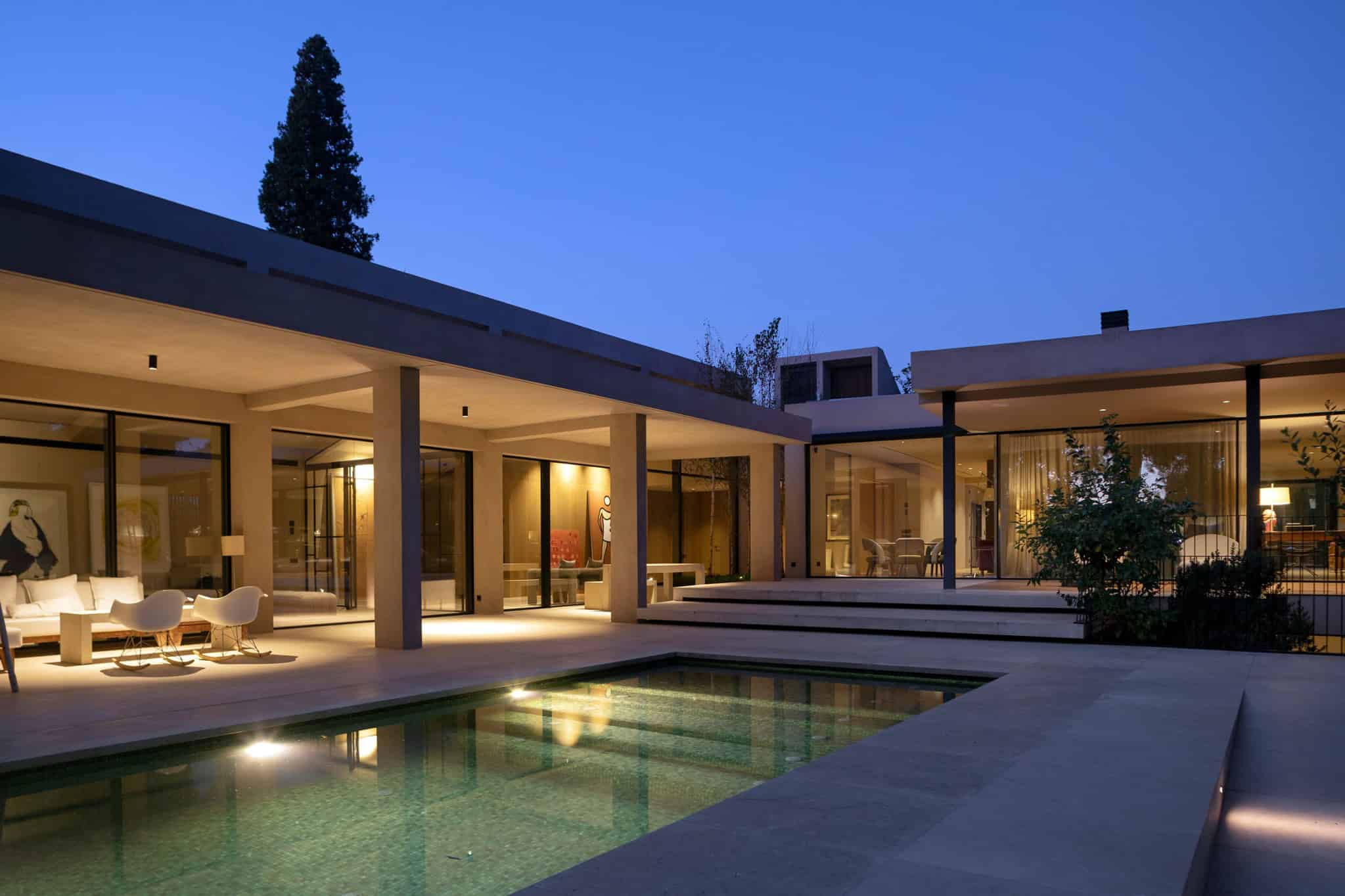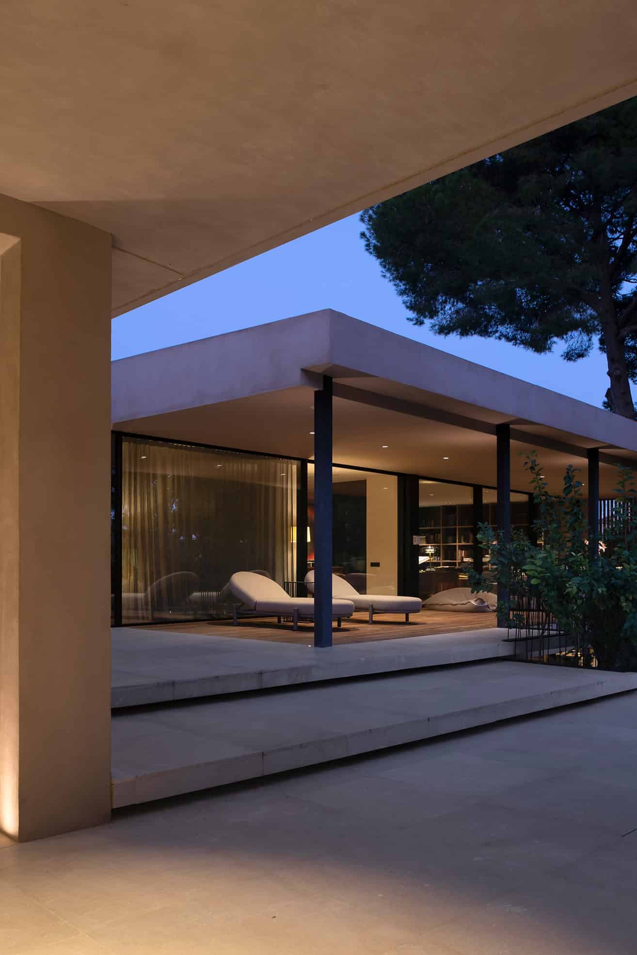 Evening-lit terrace with minimalist lounge chairs and floor-to-ceiling glass.