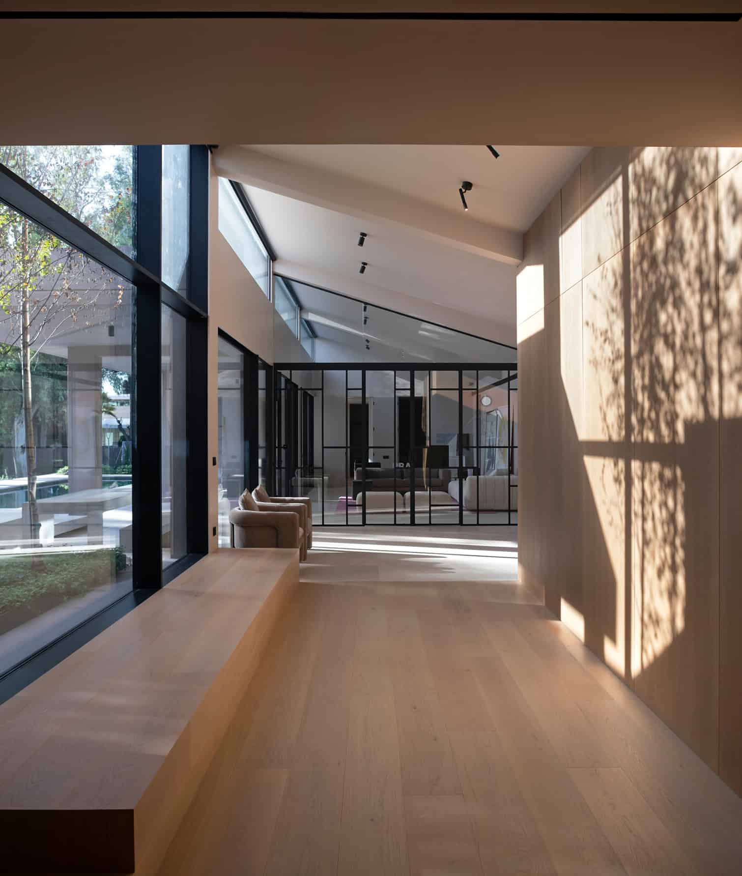 Bright hallway with natural light, wooden flooring and built-in bench. Photography © Diego Opazo