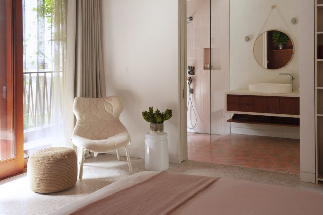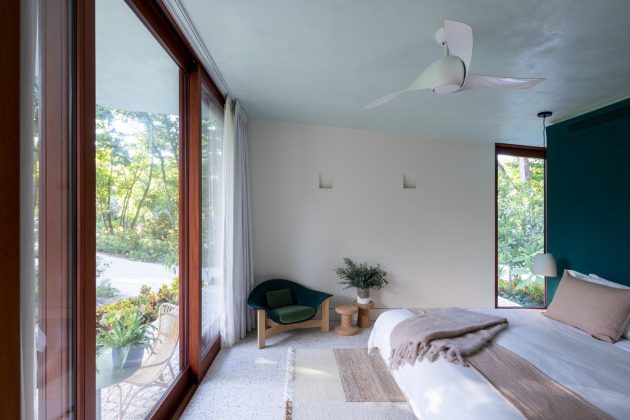 Closer to the Retreat House, the Guest House is a quiet, sun-drenched 4-bedroom, 4-bathroom oasis for additional guests. The building comprises a series of four identical suites whose orientations rotate under a single roof, where the shaded areas between each bedroom create shared outdoor spaces. The orientation of the structure was determined by two towering, age-old ficus trees (affectionately called the Avatar and baby Avatar by the architects) located in the adjacent clearing; each suite offers a view of one of the two trees through full-wall picture windows located at the foot of each bed. Located in the only area on the lush property that is a natural clearing, the home is slightly removed from the shade of the jungle canopy and receives a significant amount of direct sunlight. It also has the capacity to serve as lodging and studio space for visiting artists, acting as something of a creative residency.