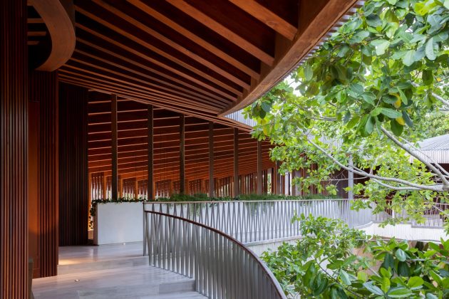 Overall, the residence’s interior spaces provide privacy while insistently pointing towards the spellbinding landscape outside. Dramatic spatial moments and views of breathtaking natural vistas punctuate each room and drive circulation through the home. “A sense of discovery keeps moving you from one space into the next,” explains Young. Each of the home’s seven bedrooms features a flood of natural light and a private balcony for the jungle- and ocean gazing. Most spectacularly, the master bedroom slips out from the rest of the second floor to offer views in all directions. The balcony features a private meditation nook and yoga platform designed specifically for the wife.