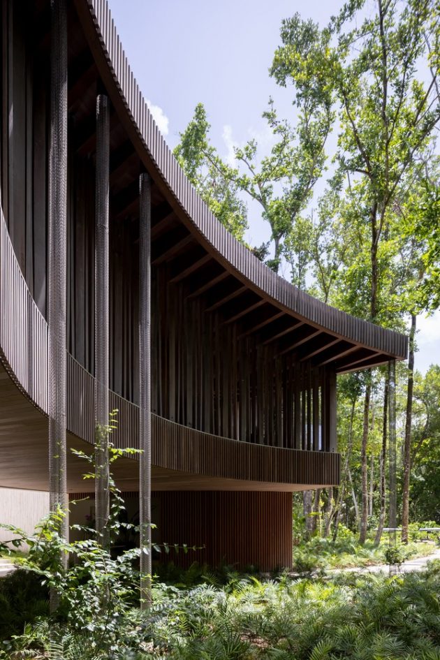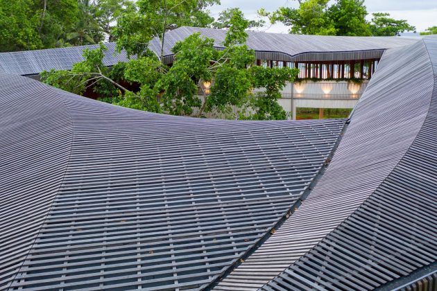 The jungle canopy becomes another architectural guideline for the home: its roof nearly grazes the canopy’s lower leaves but does not disrupt them. The roof is a defining element of the residence. Constructed from 160 exposed scissor trusses that change shape and rotate, it undulates across the top of the home, accentuating the residence’s semi-circular form and the panoramic experience of the site. The wife has compared the animated roof geometry to yoga positions.