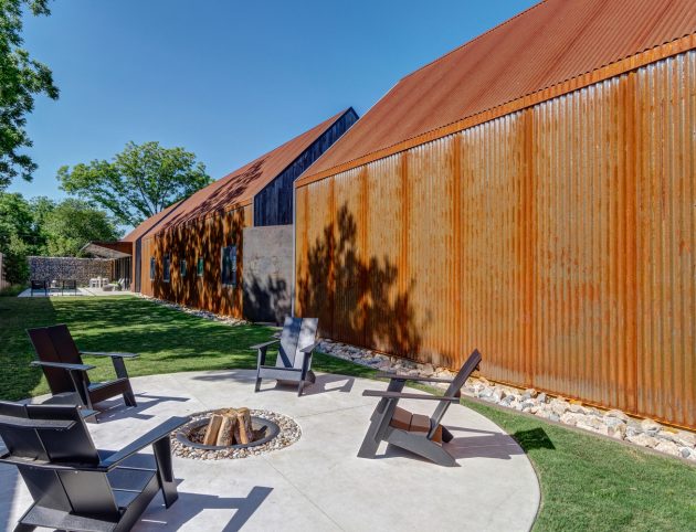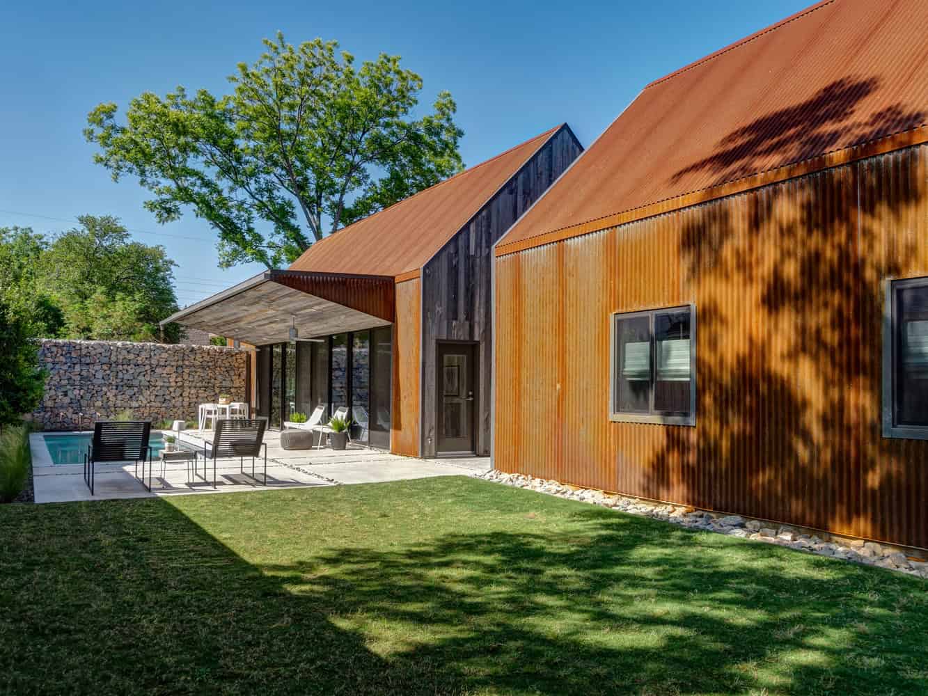 The roof and exterior walls are clad in recycled, corrugated steel panels intended to patina to a rusty, weathered finish. At each of the south and north elevations, the walls are clad in reclaimed snow fencing planks. A gabion wall provides privacy to the pool area and gives texture to the composition of the front elevation. The interior finishes are modest, consistent, and neutral throughout.