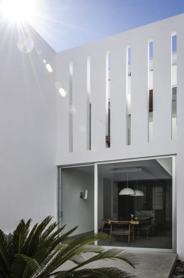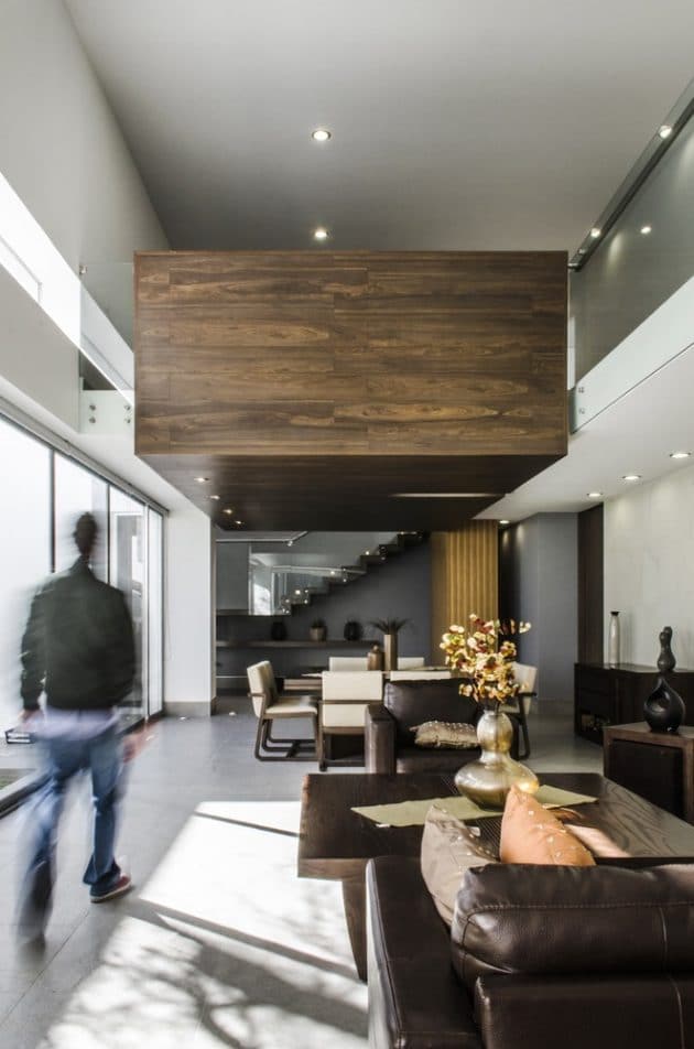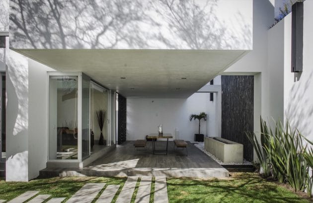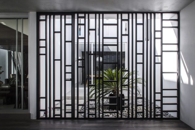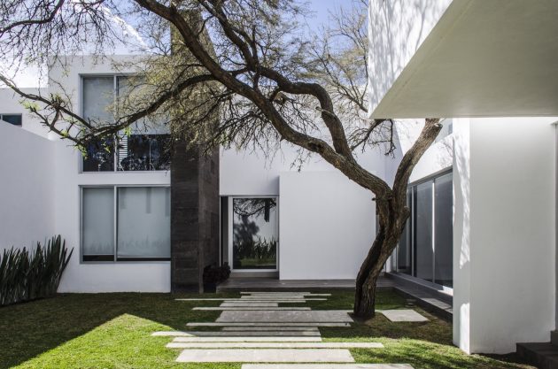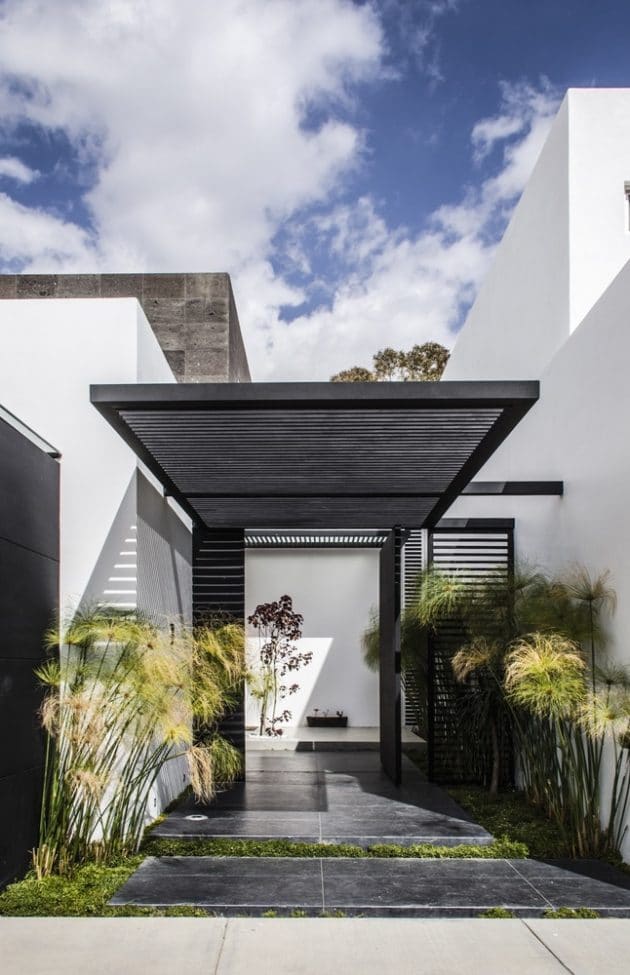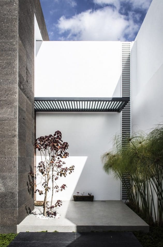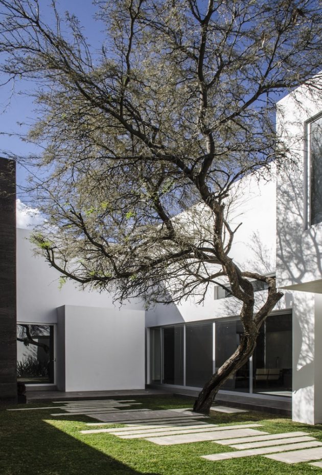 Casa Mezquite is a modern dwelling designed by BAG Arquitectura in the Mexican town of Aguascalientes. It is a two-story building that delivers about 4,900 square feet of living spaces, including four bedrooms, dressed in a monochrome color palette.