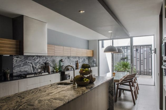 The social-natured main garden, located at the same spot as the mesquite tree, is also united by a small terrace to the private dry-environment garden. The latter is composed of sea stone and a small palm tree, providing the kitchen/dining room with a distinct feeling to that of the larger green area.